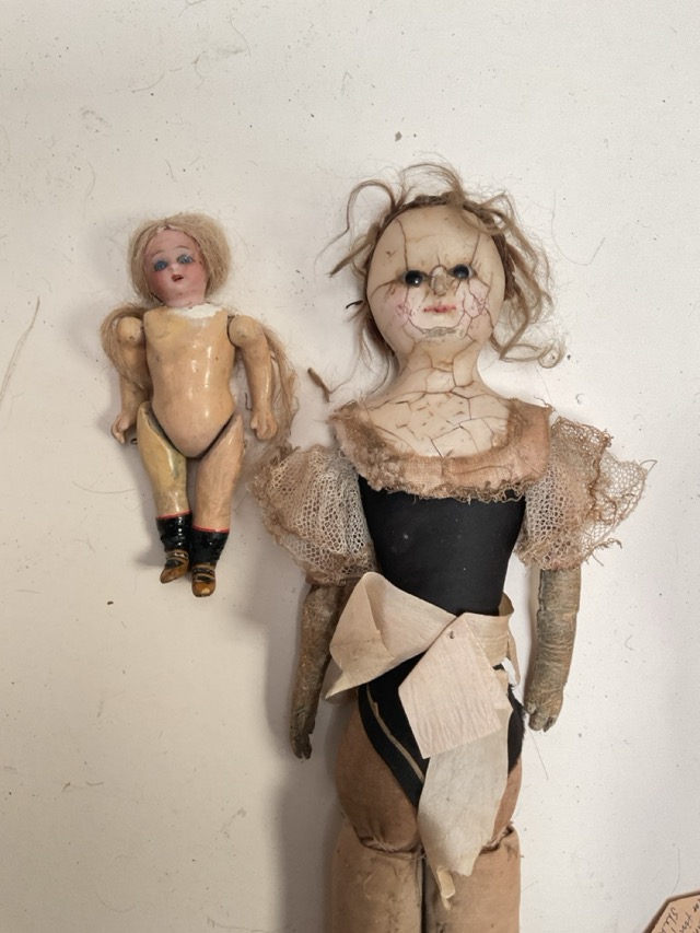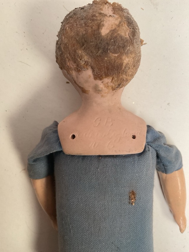 An English 1830s doll, the waxed papier-mâché head & shoulders on a cloth body with leather arms; a C19th boy doll with porcelain head and composition hands & feet, stamped GB Made in England No 6; and a miniature 1890s doll. (3)
