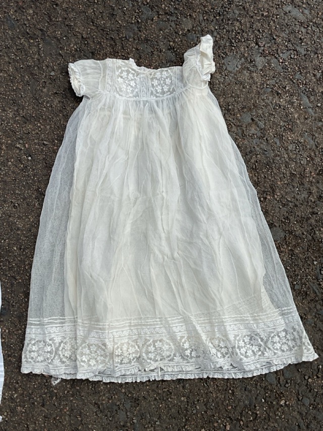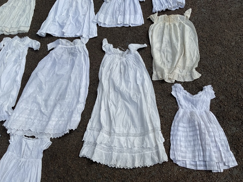 A collection of seventeen Victorian, Edwardian and later christening gowns mainly in cotton, silk & rayon trimmed with lace, whitework, broderie anglaise, etc. (17)