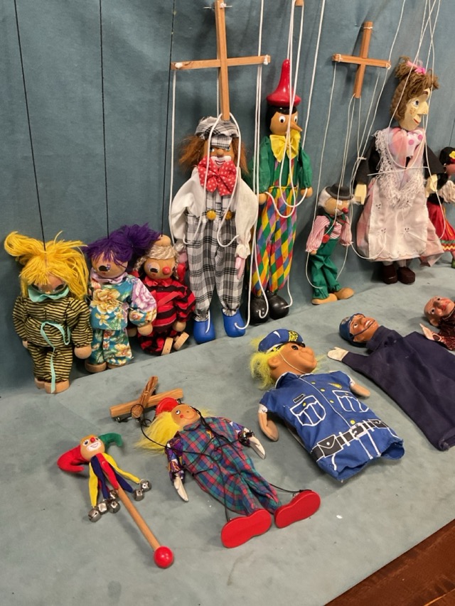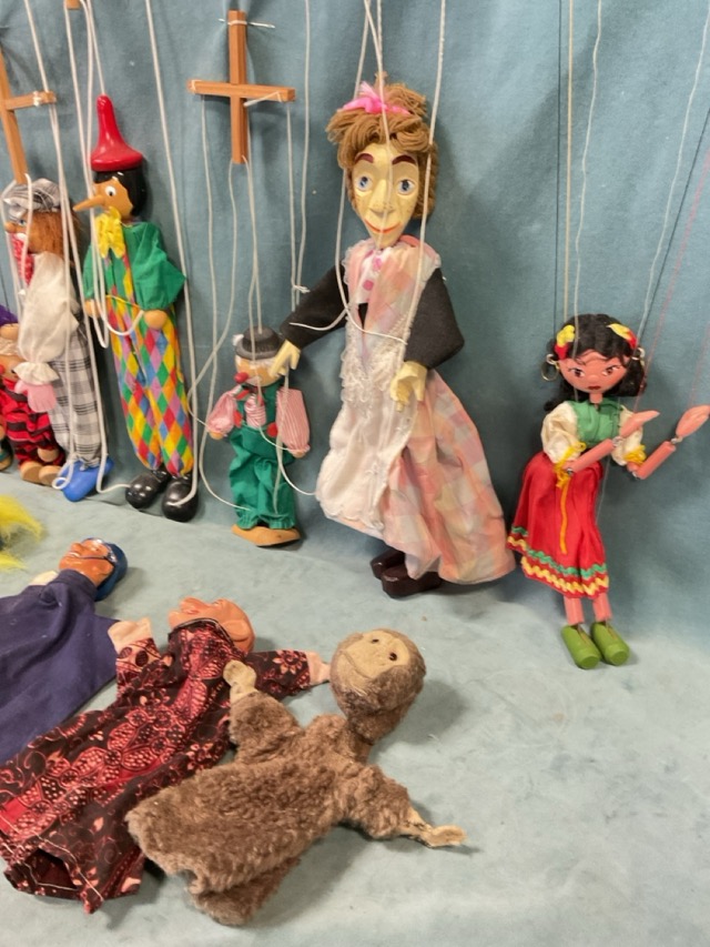 Nine marionettes - a Pelham gypsy girl, a mother with carved wood head and seven clowns; four glove puppets - a Russian Berrie troll policeman; a monkey, Mr Punch and a policeman, and a jesters head rod. (14)