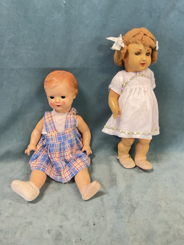 Four dolls - a 20s life-sized German baby with open mouth, sleep eyes and mama box, a similar English example with painted open mouth, a 50s girl with closed mouth, sleep eyes and mama box, and a 20s French walking girl with fixed eyes, mohair wig, and original costume. (4)