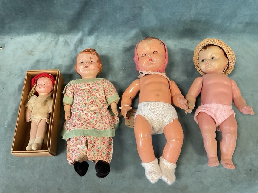 Two 50s Roddy walking dolls with original costumes; a boxed German cloth bodied doll with composition head; a 30s American Horsman Jane doll with original costume; a 40s BND London composition baby doll with sleep eyes and mama box; and another composition baby doll. (6)