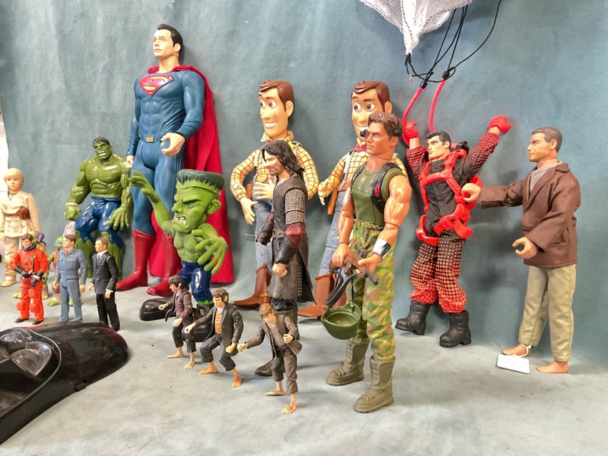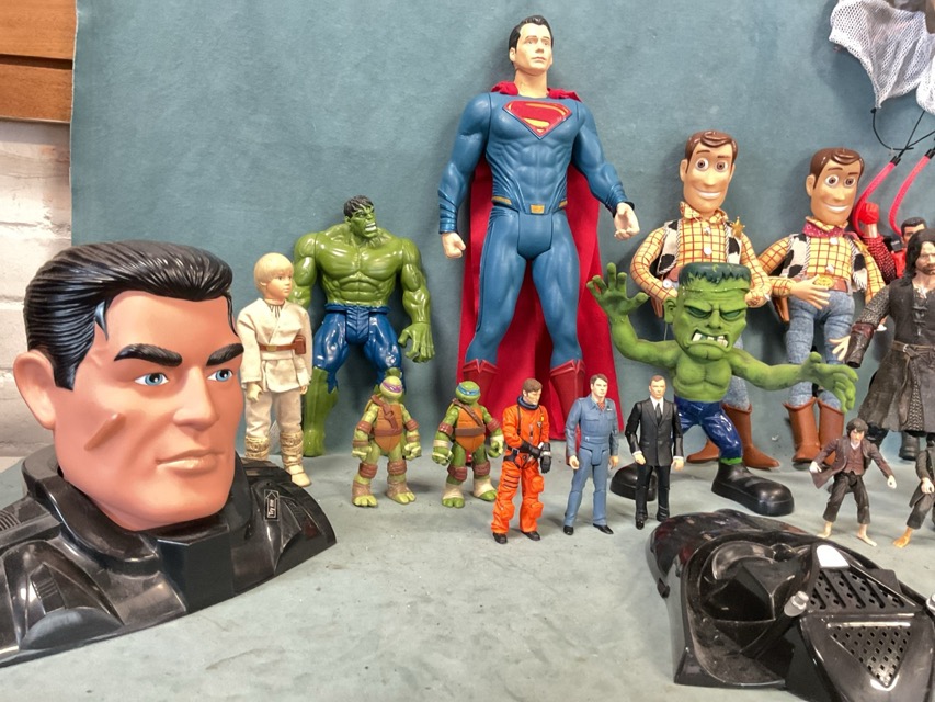 A collection of TV, film and action figures - Superman, the Incredible Hulk, Woody from Toy Story, Star Wars Anakin Skywalker and a Darth Vader face mask, Action Man, Dr Who, Lord of the Rings, Ninja Turtles, and Stretch Screamer Frankenstein. (20)