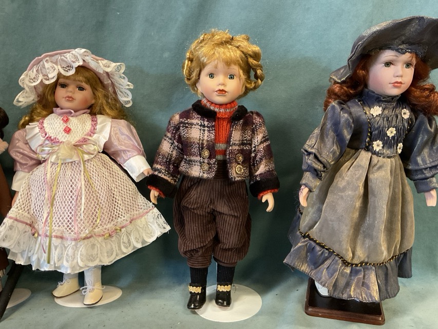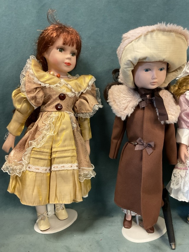 Five porcelain head dolls with cloth bodies and ceramic lower limbs, dressed in elaborate Edwardian style costumes, with stands. (5)