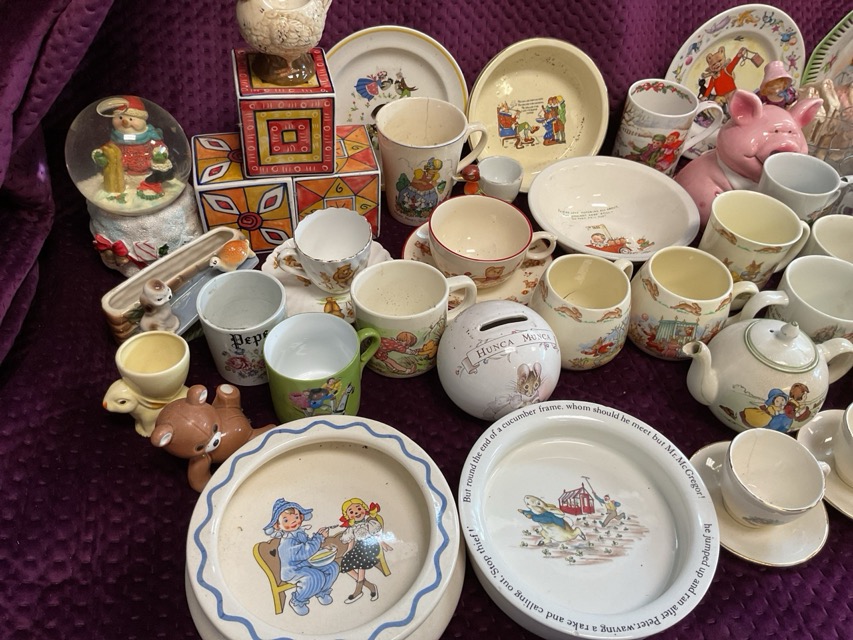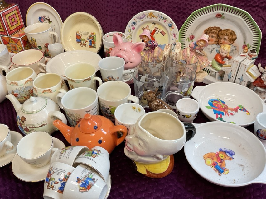 Miscellaneous childrens ceramics - moneyboxes, teasets, book-ends, Bunnkins, mugs, egg cups, Wedgwood, cups & saucers, Hornsea, a set of four Shrek glasses, etc. (A lot)