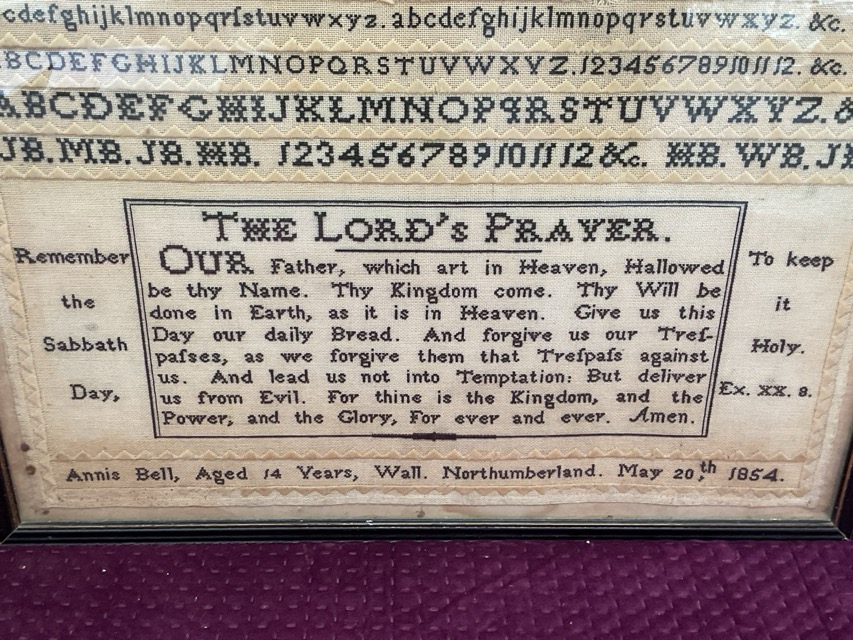 An 1854 sampler by Annis Bell from Wall, Northumberland aged 14, sewn in black wool with alphabet, numbers, vowels and prayer, laid down and hogarth framed. (18.75in x 16.75in)