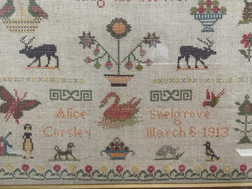A colourful 1913 sampler sewn by Alice Corsley Snelgrove, with alphabet & numbers above motto with birds, butterflies, flowers, windmills, trees, deer, owls, etc., the panel framed by floral border, oak framed with gilt slip. (15.5in x 16.5in)