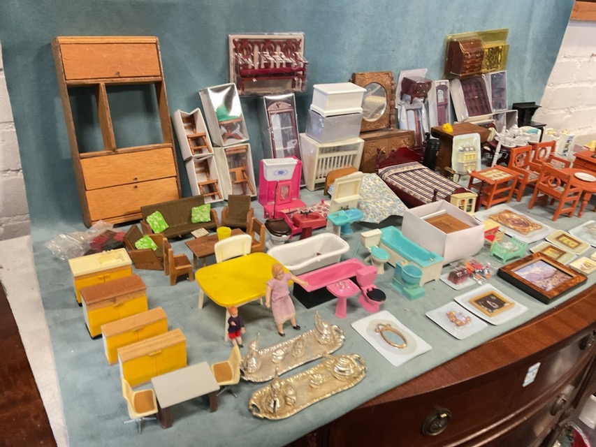 A collection of dolls house furniture and accessories - kitchen appliances, bathrooms, bedroom furniture, chairs, tables, cabinets, wirework conservatory furniture, framed pictures, teasets, brass candlesticks, electric light fittings, etc. (A lot)