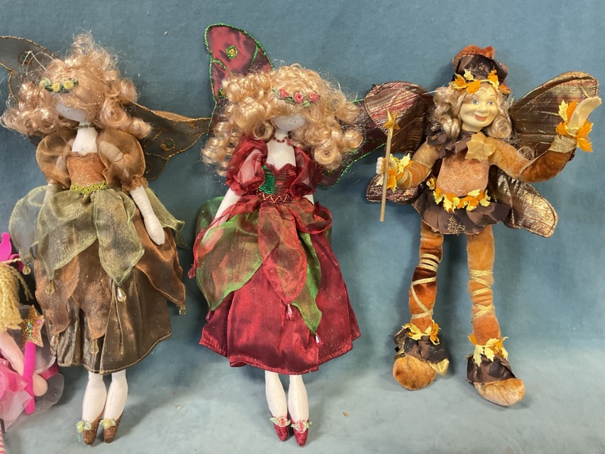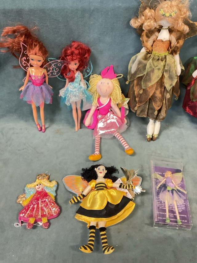 A collection of fairies - a pair with cloth bodies and gauze wings, a wire framed woodland fairy, a pair with clear acetate wings, a Felicity Wishes cloth bodied piece, a boxed petal fairy, a flying figure with suspension loop, a sequinned purse and two resin figures. (12)