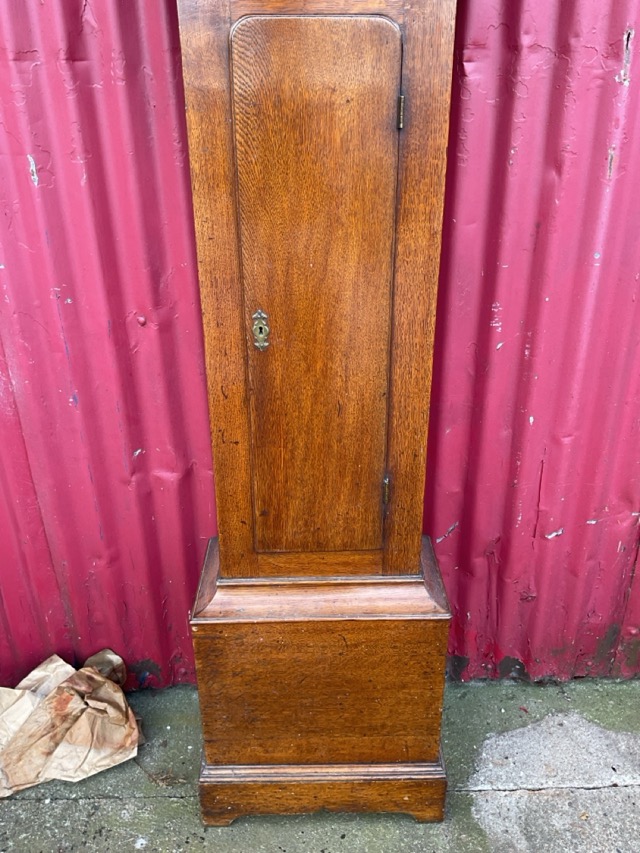 A nineteenth century oak longcase clock with swan neck pediment having fretwork panels and brass ball finials above a glazed door, enclosing a brass dial with roman chapters below a rocking ship panel, with pierced foliate scrolled spandrels, having plain trunk and moulded base. (81.5in)