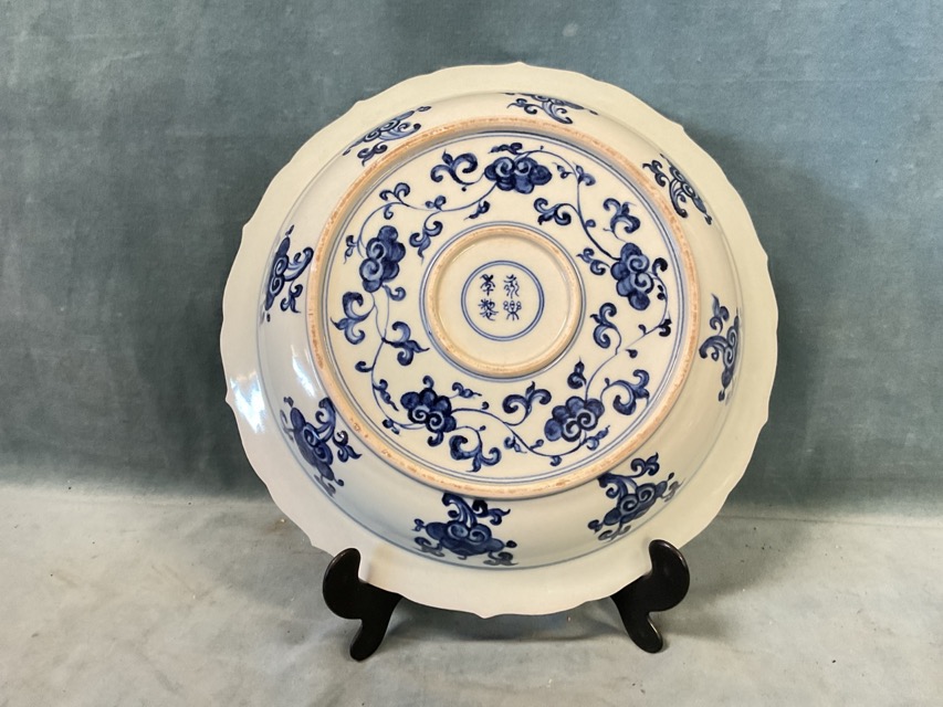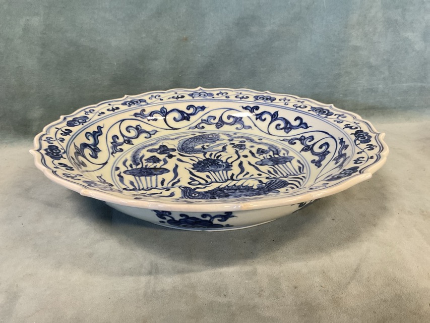 A Chinese Kangxi style scalloped blue & white bowl decorated with fish to central panel framed by scrolled borders, the exterior with conforming foliate scrolled decoration - four character mark. (16.75in)