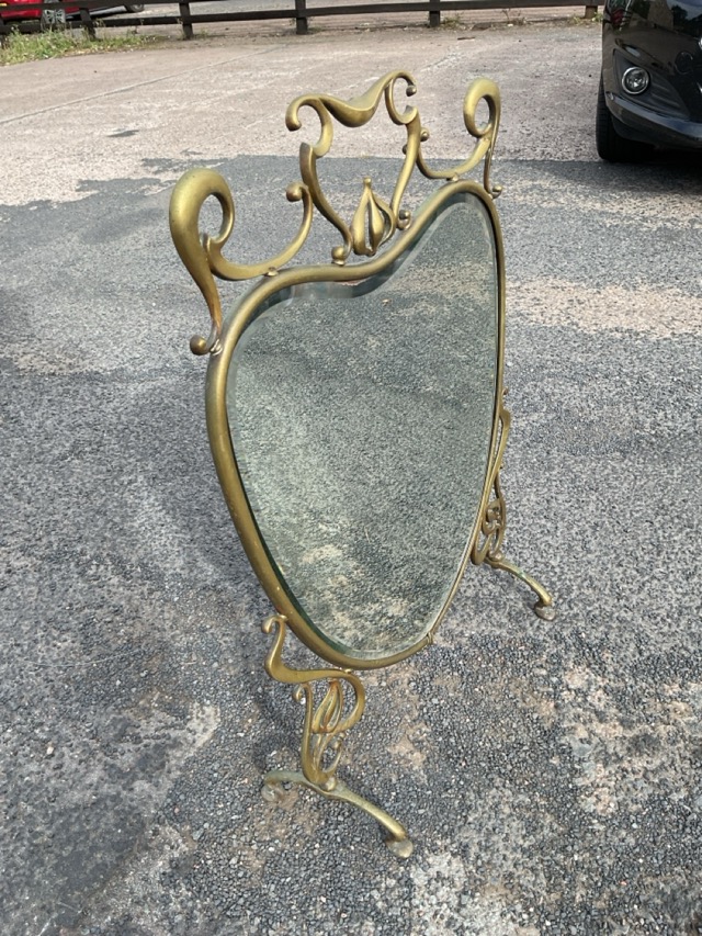 An art nouveau brass firescreen with heart shaped bevelled mirror plate in sinuous pierced scrolled frame on pad feet. (29.25in x 19in)