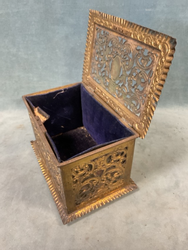 A rectangular brass casket with pierced foliate scrolled panels in gadrooned borders, having oval vacant cartouches, the interior with velvet lining. (9in)