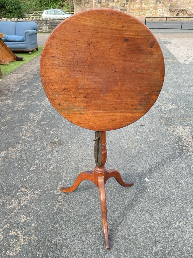 A nineteenth century mahogany snap-top circular occasional table with rise & fall mechanism to turned column, raised on tripod supports. (19in x 30in)
