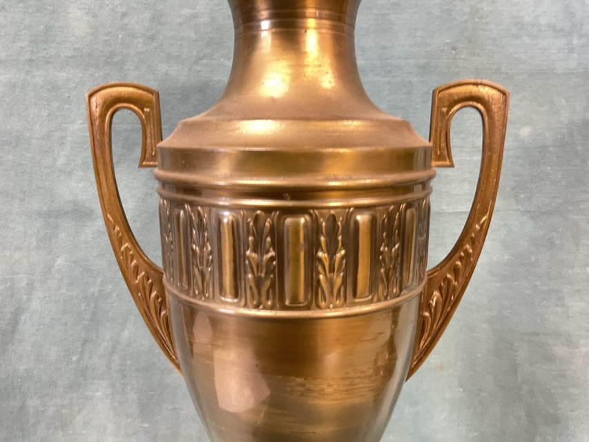 A pair of neoclassical brass urns of trophy form with waisted concave necks and leaf embossed friezes, supported on socles with square plinths. (20.5in) (2)