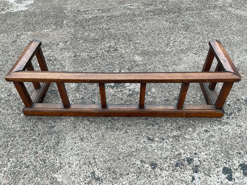 An oak cottage club type fender with chamfered rail on square columns above a moulded curb. (51in )