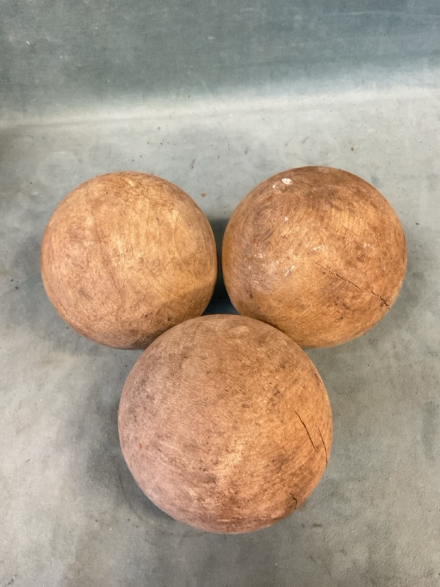 A set of hardwood 'country house' skittles with three 5in balls. (10)