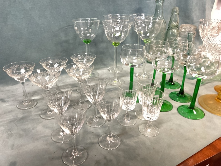 Miscellaneous glass - sets of glasses, a cut glass fruitbowl, five tall signed art glass wine goblets, dressing table pots, dug-up type bottles - torpedo, Stourbridge, Worcester, North Berwick, etc. (A lot)