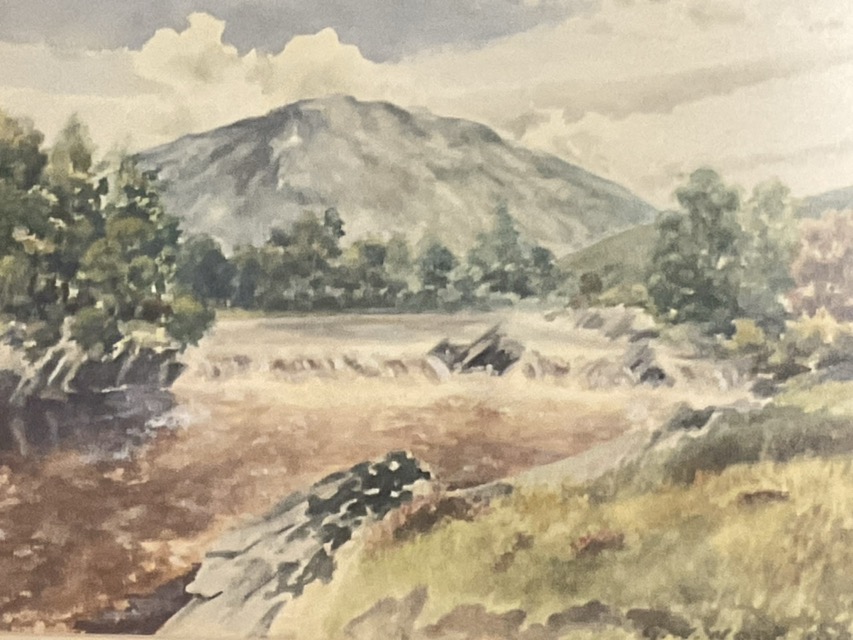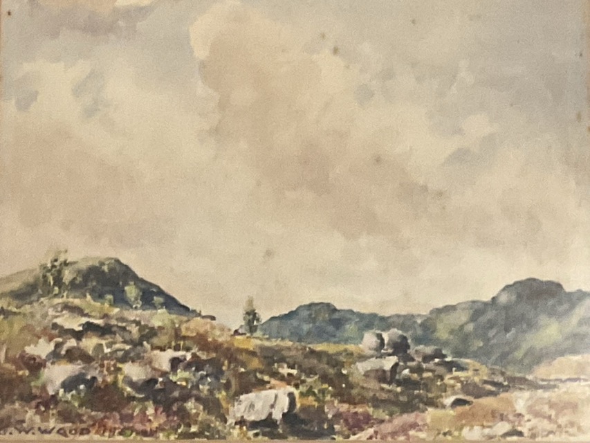 GW Wood, watercolours, a pair, hilly landscapes - one with river and weir, signed and dated, mounted & framed. (11.25in x 8.75in) (2)