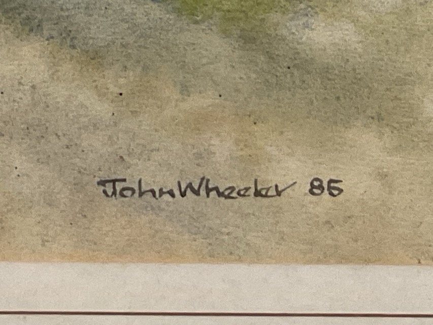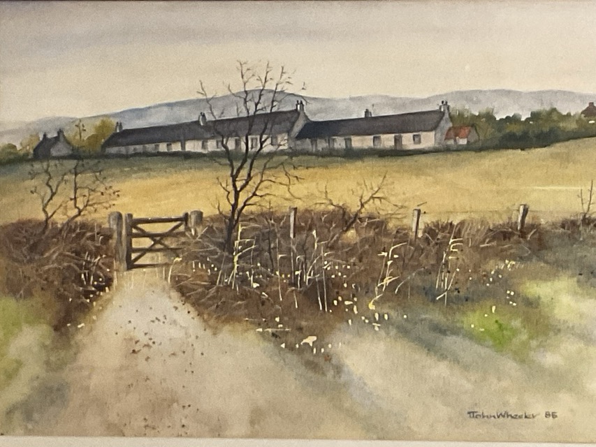 John Wheeler, watercolour, row of cottages in landscape with fence in foreground, signed, mounted & framed. (12.75in x 9in)