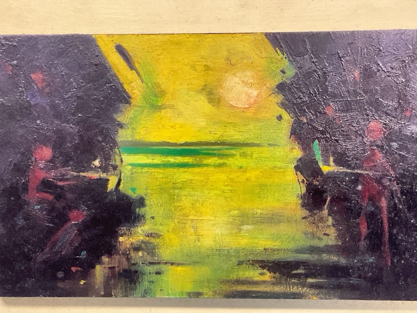 Oil on board, sunset over water, unsigned, float mounted on board. (10.75in x 6.5in)