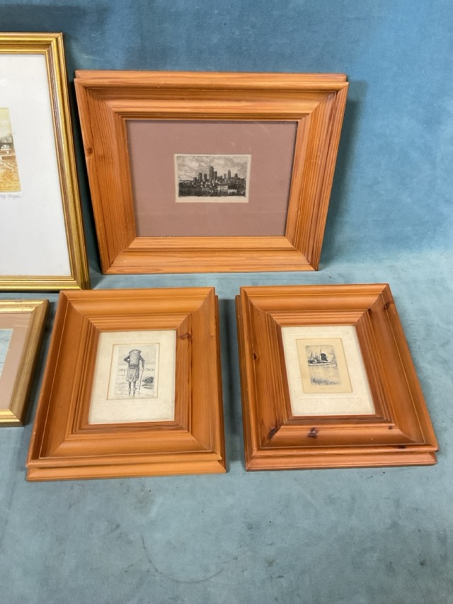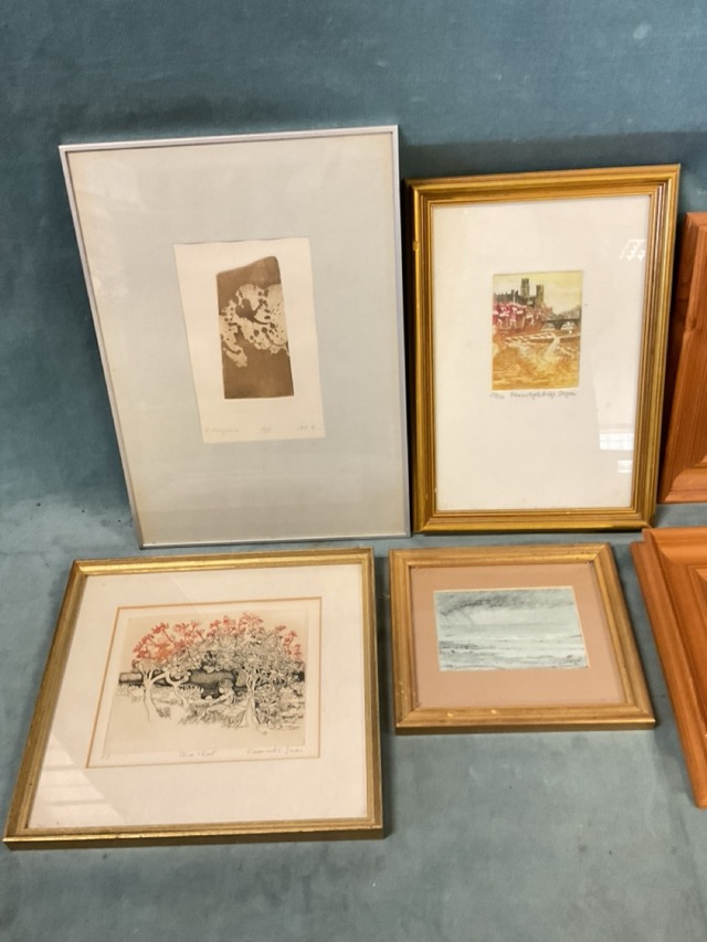Seven framed etchings, mostly signed, old & contemporary, artists proofs, one crayon, etc., - WG Mercer, Rosamund Jones, K Crawford, J Degnau, etc. (7)