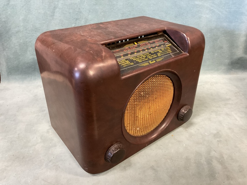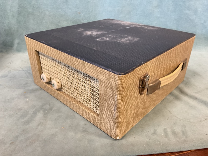 A Bush DAC 90A tortoiseshell style bakelite radio with circular speaker & glass dial; and an EAR portable cased gramophone. (2)