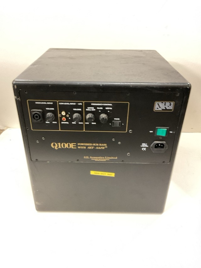 A cube shaped REL Acoustics Ltd powered sub base speaker - model Q100E, together with miscellaneous cables and leads. (16in x 16in x 16in)