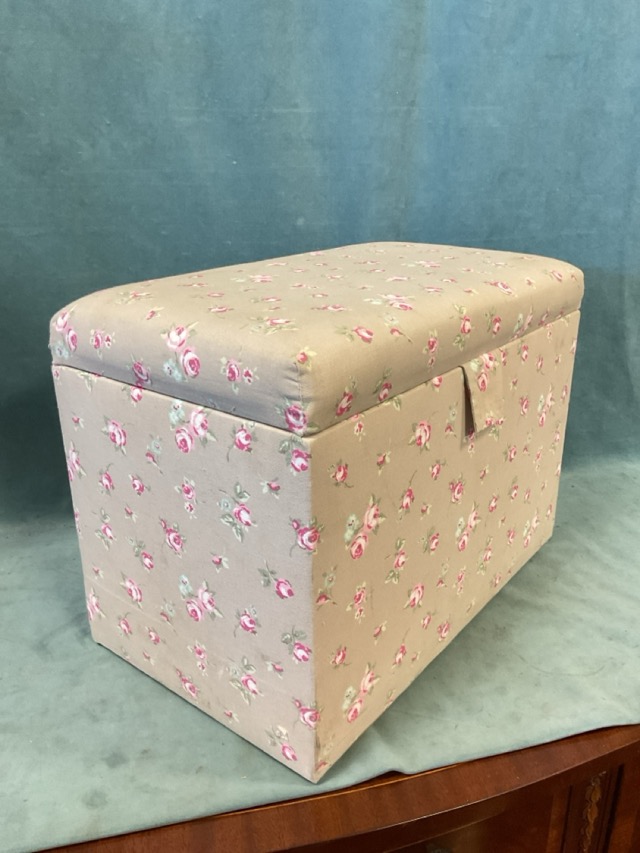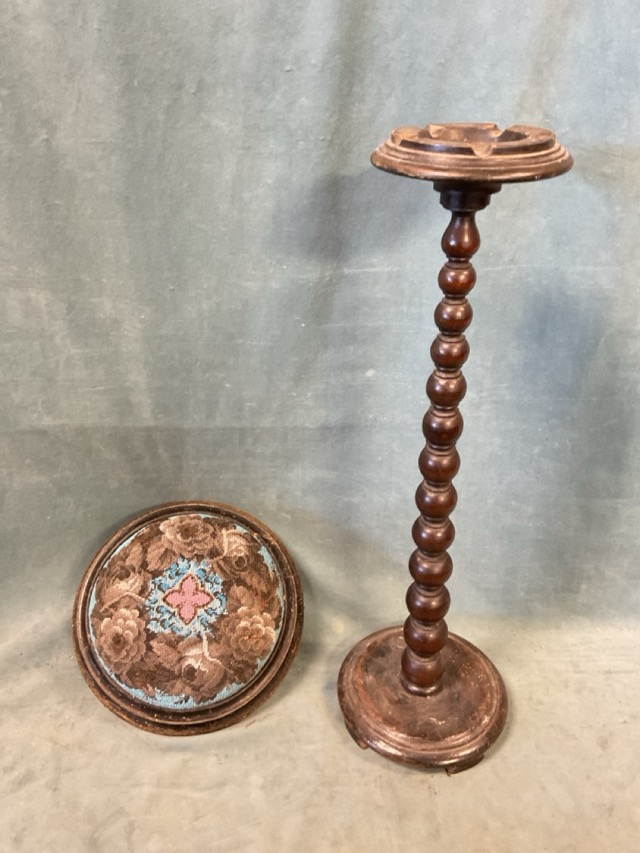 A circular Victorian beadwork footstool in ebonised moulded frame with brass mounts on turned feet; an Edwardian smokers stand with tapering ball column on circular moulded base; and a modern floral upholstered ottoman box stool. (3)