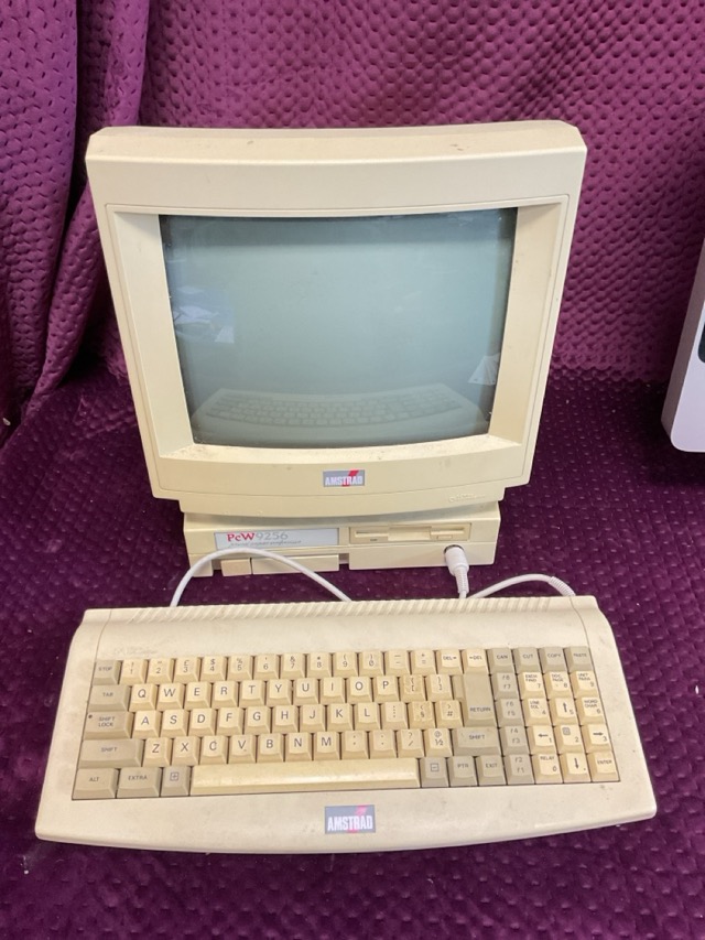 An old Amstrad computer & keyboard - PcW9256; a cased portable Erika manual typewriter; and a modern ‘hardly turned on’ Apple Mac computer with discs, cables and an HP printer. (A lot)