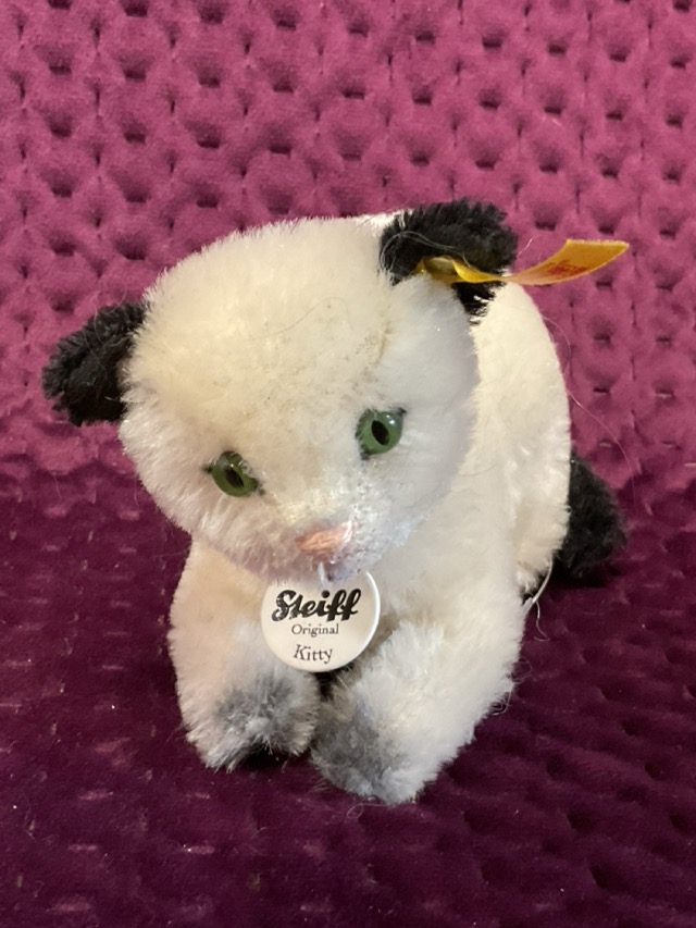 A Steiff black & white mohair Kitty Katze, having green eyes and stitched nose. (5.25in)