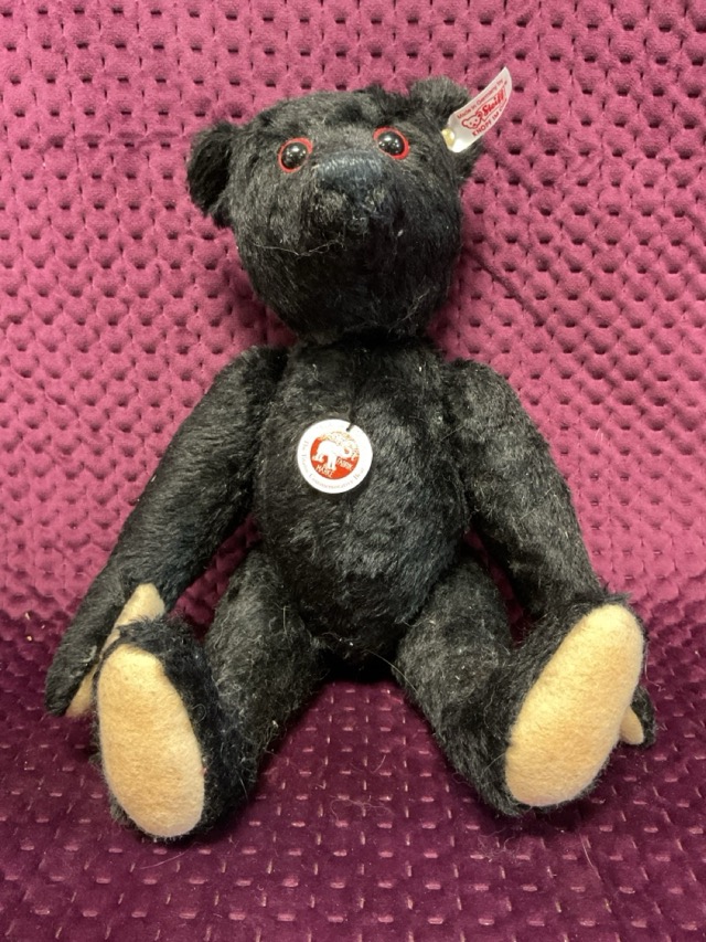 A Steiff Titanic Commemorative Bear, the black mohair body with hump-back, having functioning growler, jointed limbs, felt pads, etc. (13in)