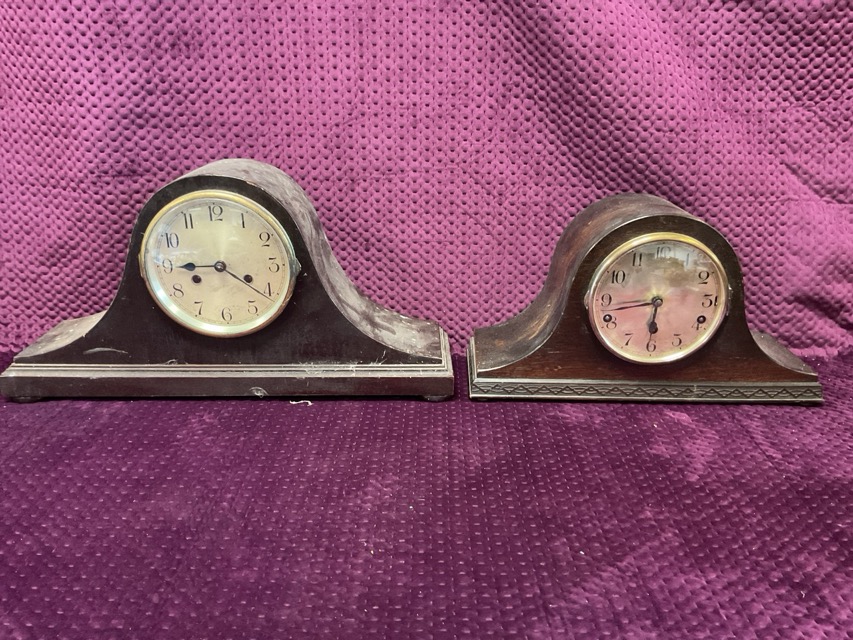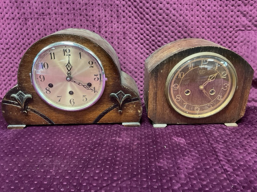 Four mantle clocks - nelsons hat type, Smiths Enfield, oak cased, silvered dials, Westminster chiming, etc. (4)