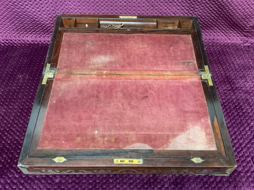 A regency rosewood writing box with brass scrolled inlaid decoration, having fitted interior with three secret drawers below pen tray. (20in)