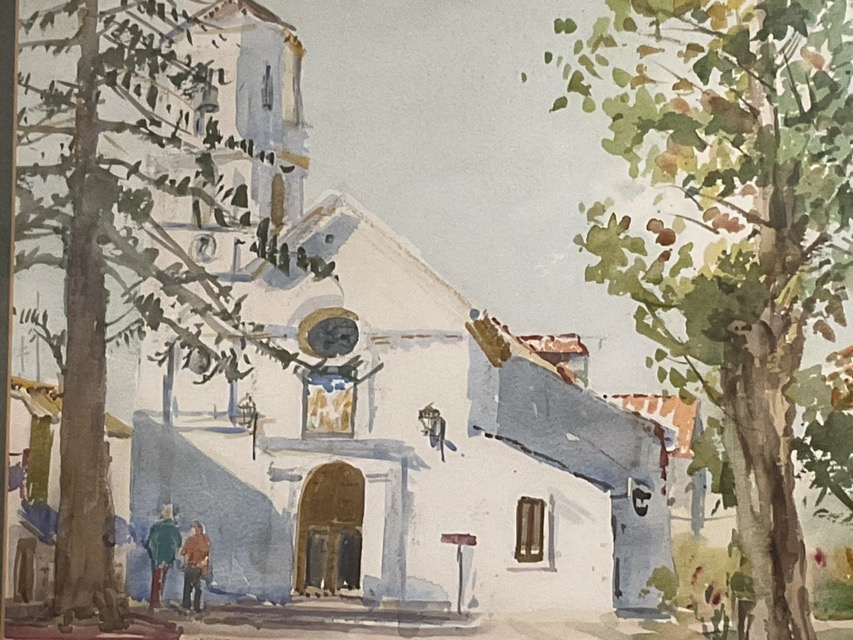Carol Hageman Dodds, watercolour, study of swallows at nest, signed, mounted & framed; and Day, watercolour, summer scene with two figures outside a church, signed, mounted & framed. (2)