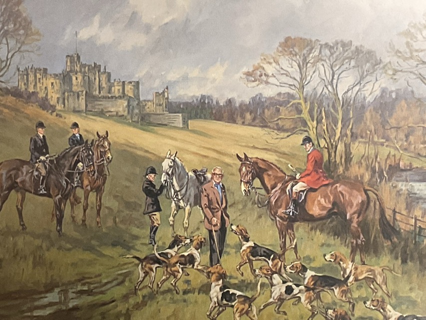 John King, lithograph, landscape below Alnwick Castle with Duke Hugh standing amongst hounds and riders, mounted & framed; and Robin Furness, landscape view of hunt in the field, mounted & framed. (2)