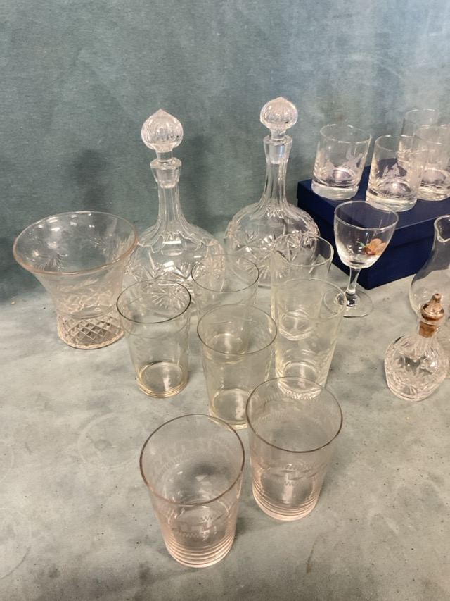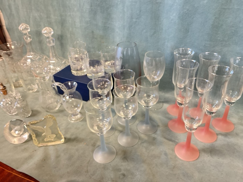 Miscellaneous glass - a pair of decanters & stoppers, a boxed set of bird engraved tumblers, a signed vase, two sets of frosted wine goblets, drinking glasses, etc. (A lot)