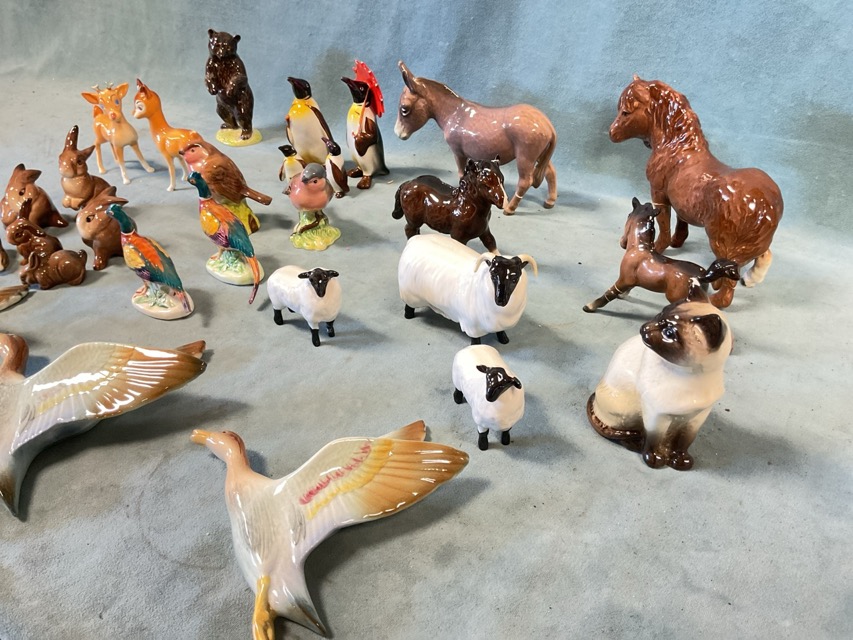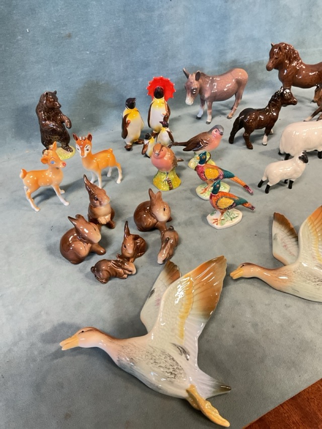 A collection of Beswick ceramic animals - bear, chamois, deer, robin, chaffinch, pheasants, penguin family, ponies, a donkey, sheep, rabbit family, Siamese cat, and a set of three flying ducks. (28)