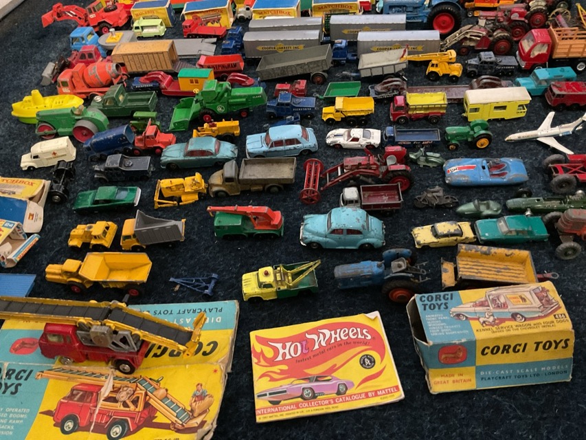 A large collection of diecast model vehicles, many boxed, including lorries, trucks, tractors, diggers, cars, fire engines, a Bat Boat, a Man From Uncle car, a Green Hornet car, horse boxes, pick-up trucks, mostly Dinky, Corgi, Matchbox, etc. (A lot)
