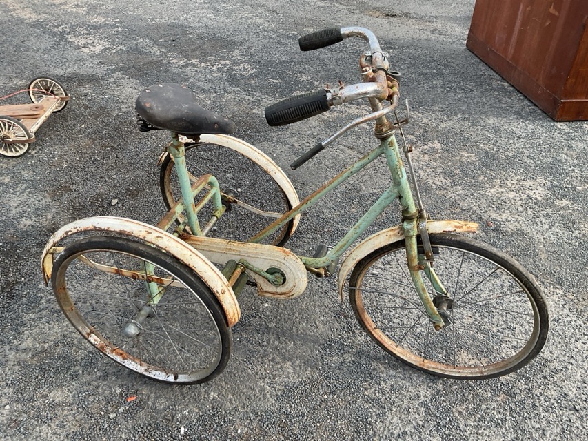 A 50s childs Lonerider tricycle with sprung seat, spoked wheels, bell to handlebars, chainguard, etc; and four-wheel go-cart with wood frame and steering front axel. (2)