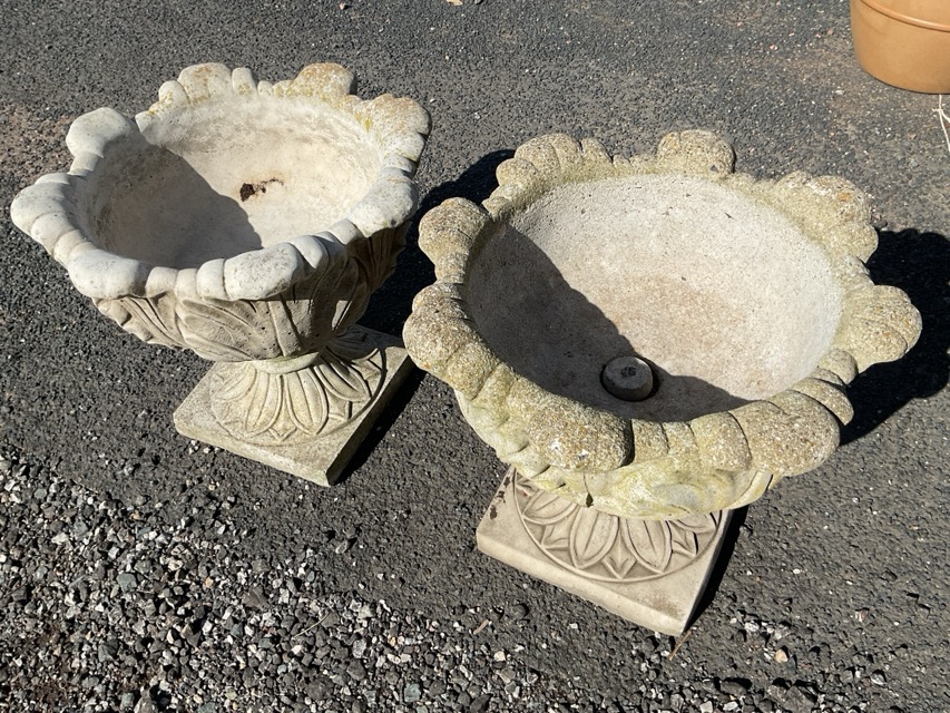 A pair of composition stone garden urns of leaf moulded form, raised on socles with square plinths. (19in x18in) (2)