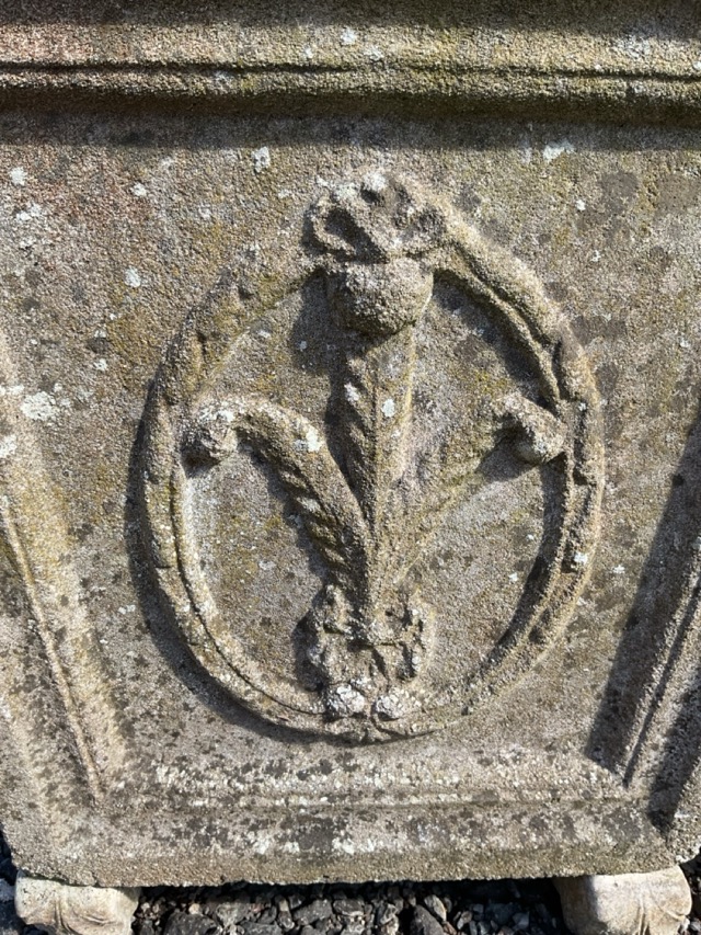A pair of square composition stone garden pots of tapering form cast with fleur-de-lils panels to sides, raised on acanthus scrolled feet. (13.75in) (2)