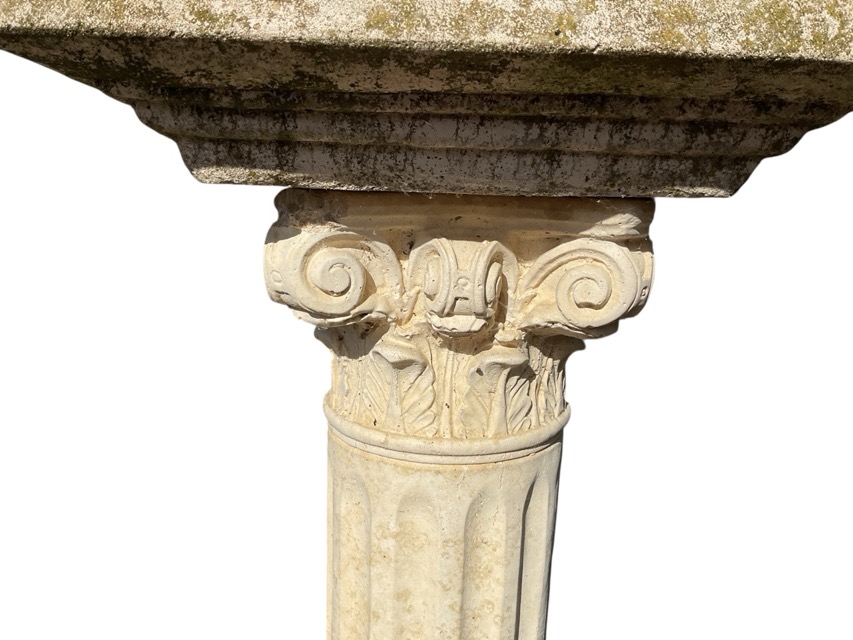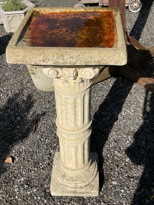 A composition stone garden birdbath with square bowl on classical fluted column with scrolled capitals, above a square plinth. (37.25in)