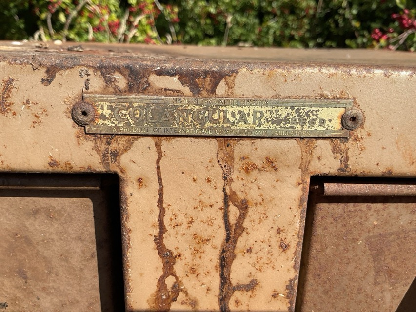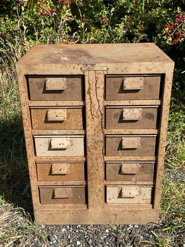 A Cocancular metal cabinet of ten drawers with rectangular label type handles. (21.25in x 15.5in x 28in)