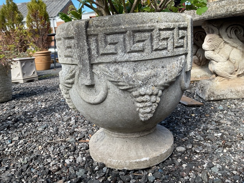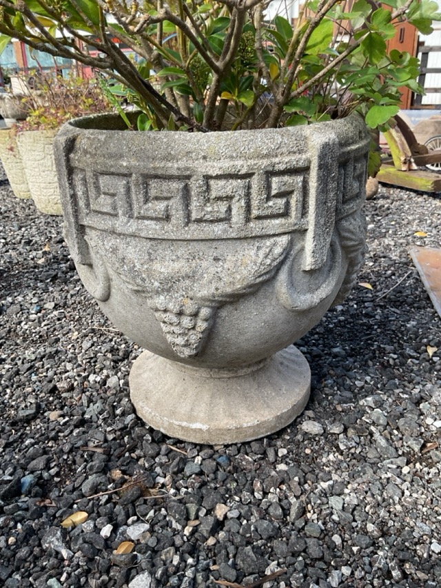 A composition stone neoclassical garden urn cast with greek key frieze and ring type handles supporting swagged vines, raised on circular fluted foot. (14in x 15 in)