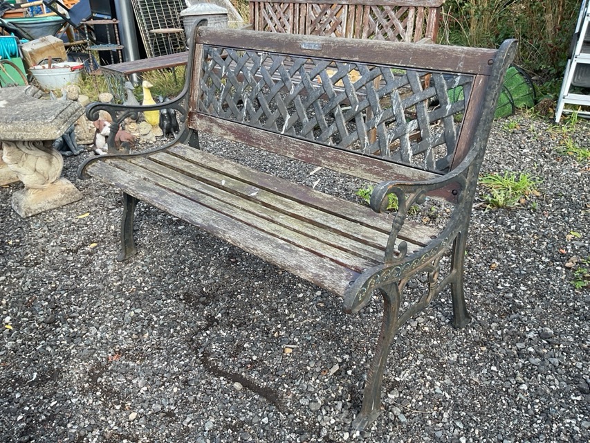 A cast iron garden bench with interwoven latticework panel to back above slatted seat framed by scrolled arms, on chanelled sabre legs. (49.5in)