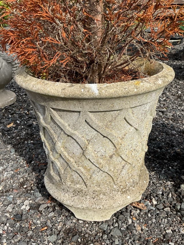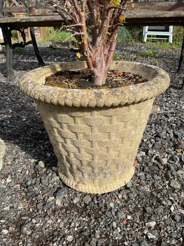 A tapering composition stone garden urn with latticework sides and moulded rim, raised on shaped feet; and another of bucket shape moulded with basketweave sides with ribbed rim & base. (13.5in & 10.5in) (2)