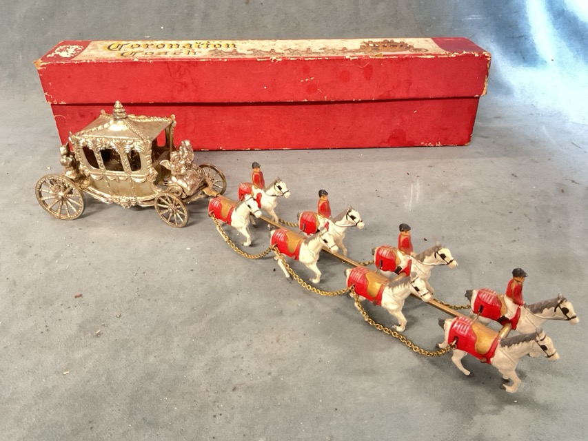 A boxed Lesney handpainted diecast model of the golden state coach with four pairs of grey horses with postillions, produced for the 1953 coronation. (15.5in)