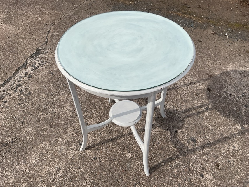 A circular painted hardwood occasional table with thick plate glass to moulded top, supported on rounded rectangular splayed legs joined by stretchers with conforming circular platform. (23.75in x 29.5in)