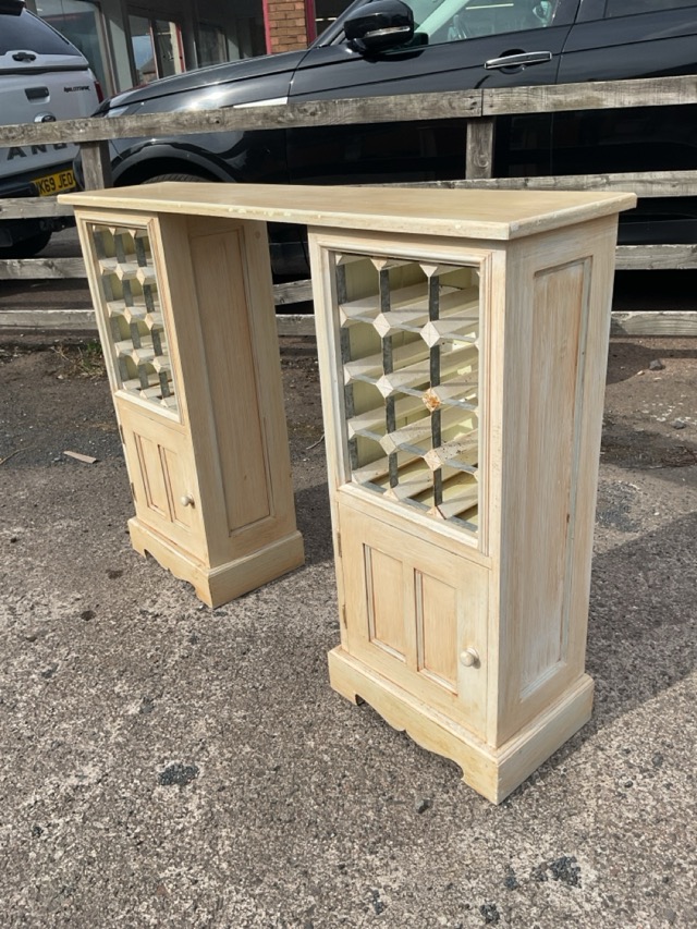 A painted winerack cabinet with a pair of panelled column pedestals with cupboards beneath a rectangular platform, the plinths with shaped aprons. (48.5in x 11in x 36.25 in)