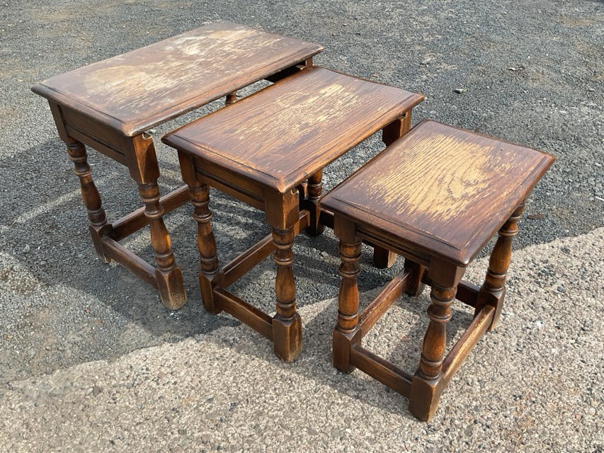 A nest of graduated oak tables with rectangular moulded tops on baluster turned legs joined by rectangular stretchers. (3)
